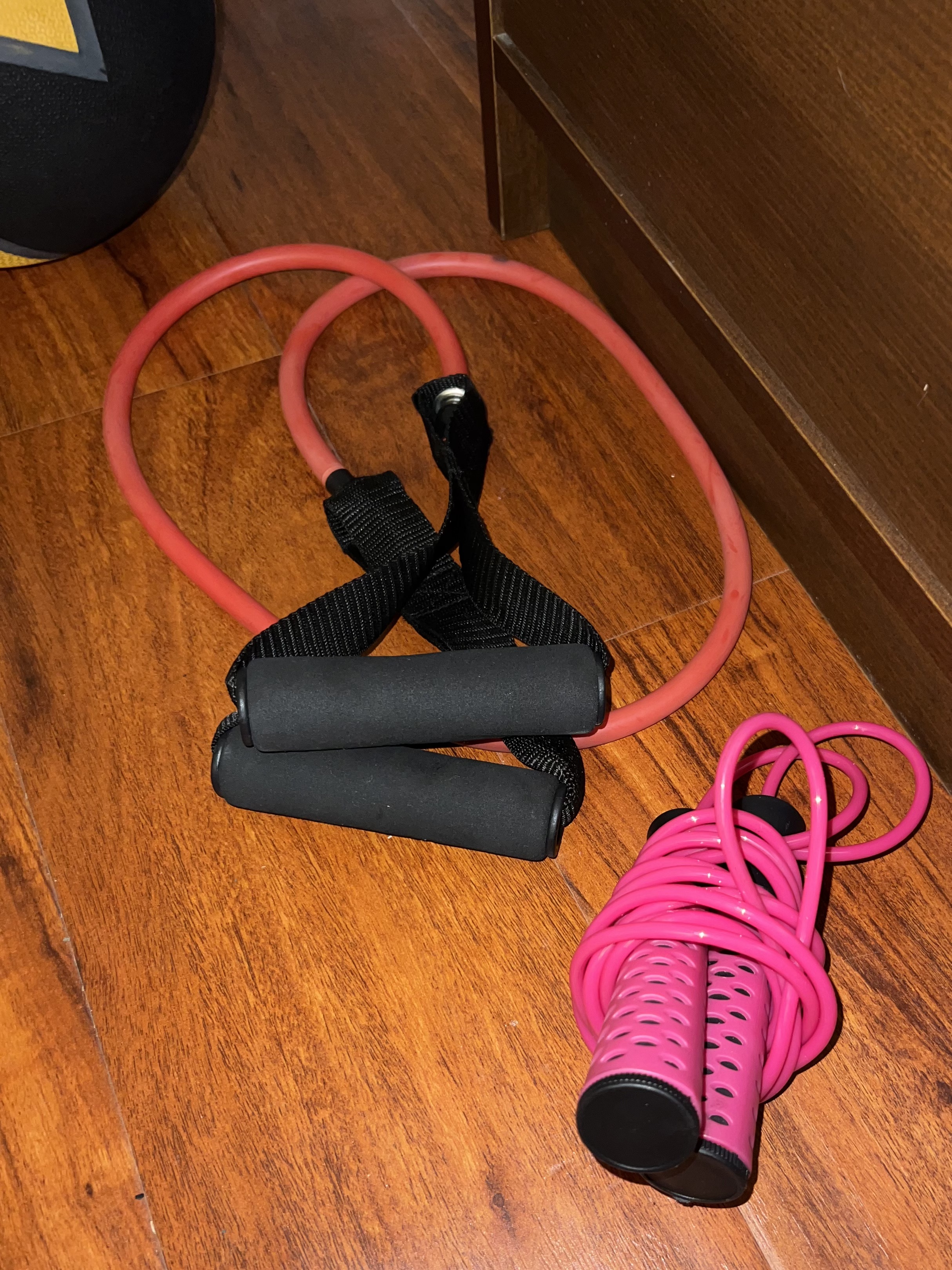 A few weeks in, I’m at our neighborhood-wide yard sale and came across a medicine ball, resistance band, and jump rope. I’m committed to a low-buy year, but felt a few pieces of equipment would help keep me on track, as feeling a plateau in getting stronger was another factor of my time away from exercise. Were these purchases justified? I did help clear up some space for my neighbors..